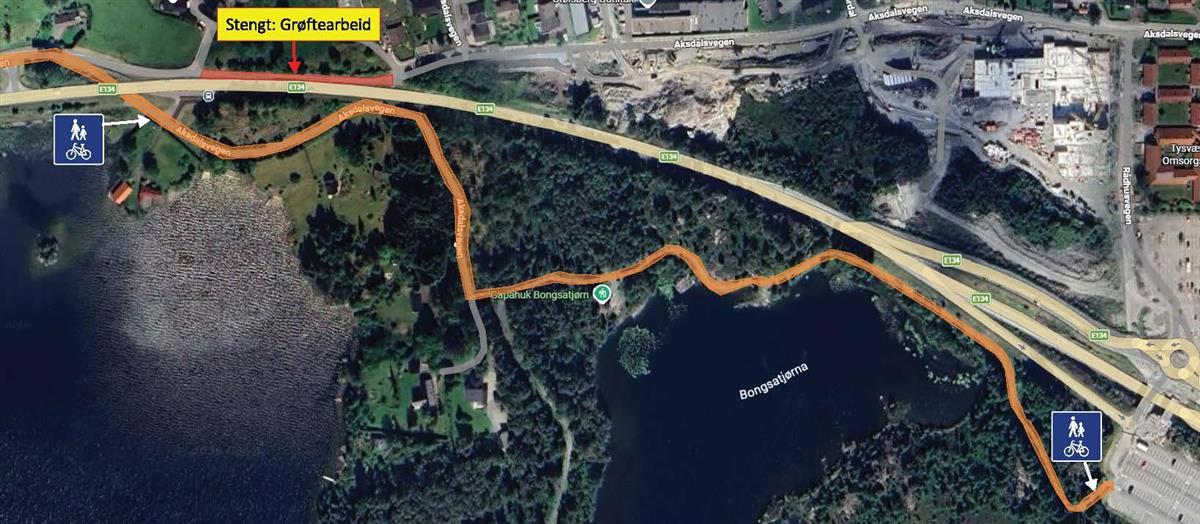Når grøftearbeidene pågår for fullt, vil det i en periode fra 18. mai til midten av juli være behov for omlegging av gang- og sykkelruten via turstien langs Bongsatjørna. Traséen vil bli tydelig skiltet.