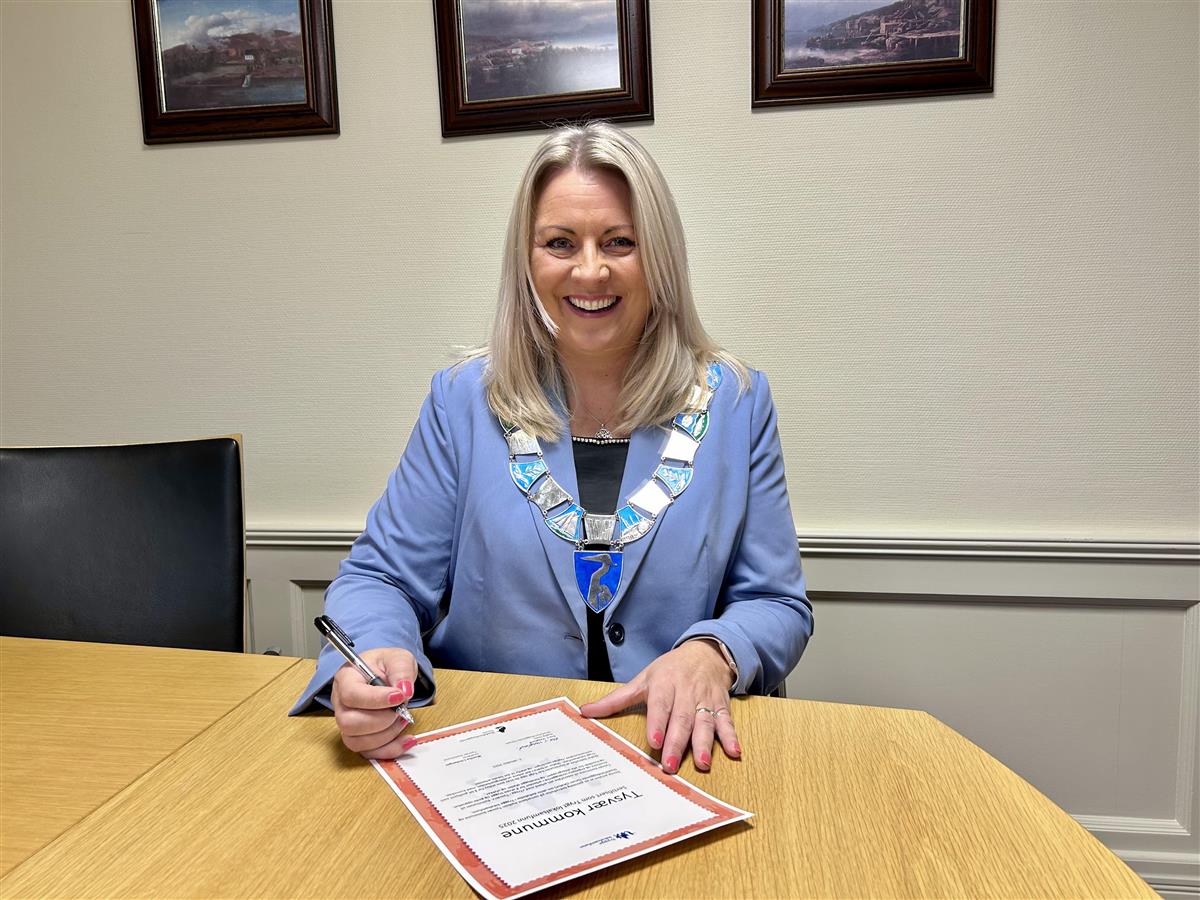Ordfører Monika Lindanger signerer avtale  - Klikk for stort bildeOrdfører Monika Lindanger signerer samarbeidsavtale med Skadeforebyggende forum. Tysvær kommune