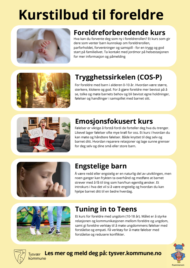 Tysvær kommune tilbyr foreldrekurs til deg som er på jakt etter nye tips og triks i foreldrerollen. Foreldrekursene passer for alle typer foreldre, med alle typer barn fra 0-18 år.