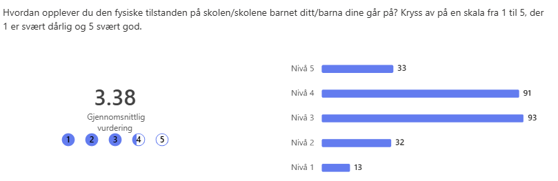 Foreldre og foresatte har vurdert den fysiske tilstanden på skolene på en skala fra 1 til 5, der 1 er «svært dårlig» og 5 er «svært god». Gjennomsnittlig vurdering er 3,38 basert på 262 svar. Fordelingen viser at de fleste plasserer tilstanden i midtsjiktet: 93 har gitt karakteren 3 og 91 har gitt karakteren 4. Samtidig er det 45 som har gitt lav score (1 eller 2), noe som indikerer at enkelte opplever betydelige utfordringer. De laveste vurderingene er særlig knyttet til forhold som inneklima, ventilasjon, bruk av brakker og standard på garderober og toaletter.
