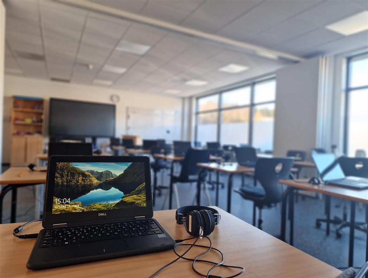 Eksamenslokale med PC-er og hodetelefoner - Klikk for stort bilde