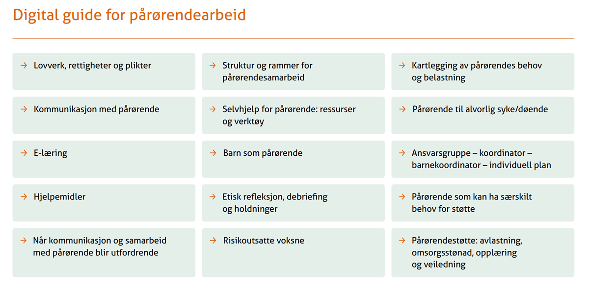 Det finnes flere gode nettressurser og verktøy for fagpersoner. Gjennom DiggPå har de samlet og utarbeidet en digital guide for systematisk pårørendearbeid