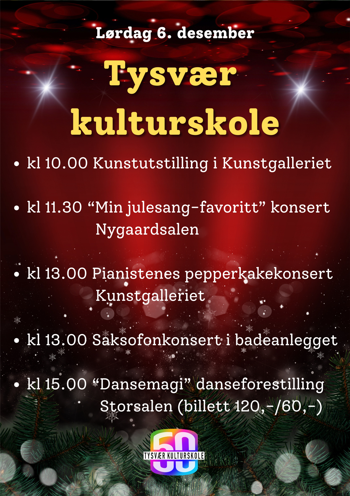 I 2025 er kulturskolen 50 år og det feiret vi skikkelig lørdag 15. mars med en jubileumslørdag på Tysværtunet kulturhus. Denne dagen var det mye som foregikk i regi av kulturskolen. Mange møtte opp og vi er strålende fornøyde med feiringen! Bilder ser du lengre ned.