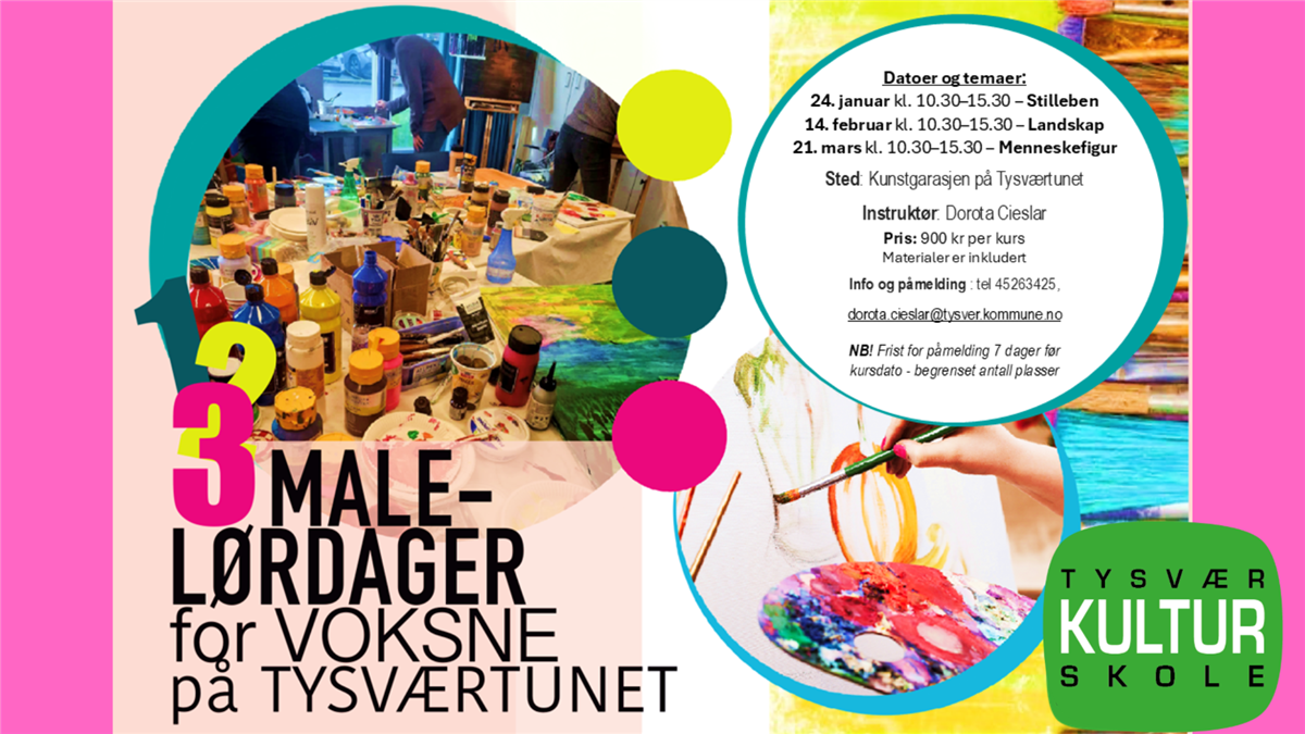 Vår kunstlærer Dorota Cieslar tilbyr ulike malekurs for voksne tre lørdager kl 10:30-15:30, i Kunstgarasjen på Tysværtunet kulturhus. De tre kursene har ulike temaer: 24. januar - stilleben, 14. februar - landskap og 21. mars - menneskefigur. NB!24. januar er avlyst pga få påmeldte.