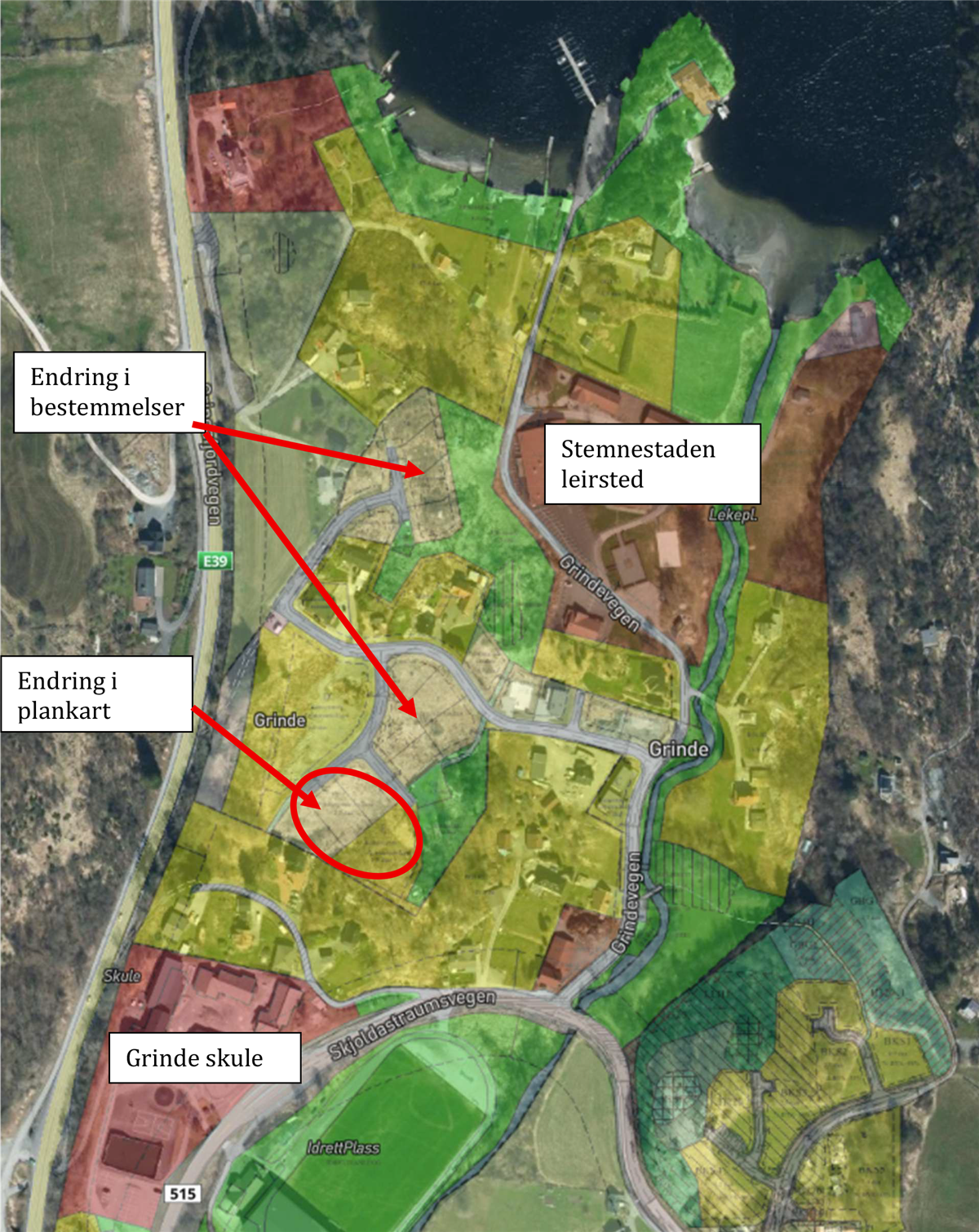 I gjeldende plan (Reguleringsplan for Grinde. Gnr. 104 bnr 5 mfl., planID 200915) er området som foreslås endret vist som frittliggende småhusbebyggelse. Planområdet ligger på Grinde i Tysvær kommune. Hele det gjeldende planområdet ligger mellom E39, Grinde skule og Stemnestaden leirsted.