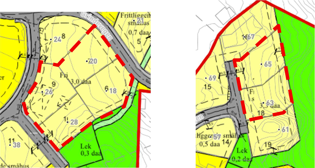 Figur 4 Tomter hvor planbestemmelses foreslås endret vist med stiplet rød strek.