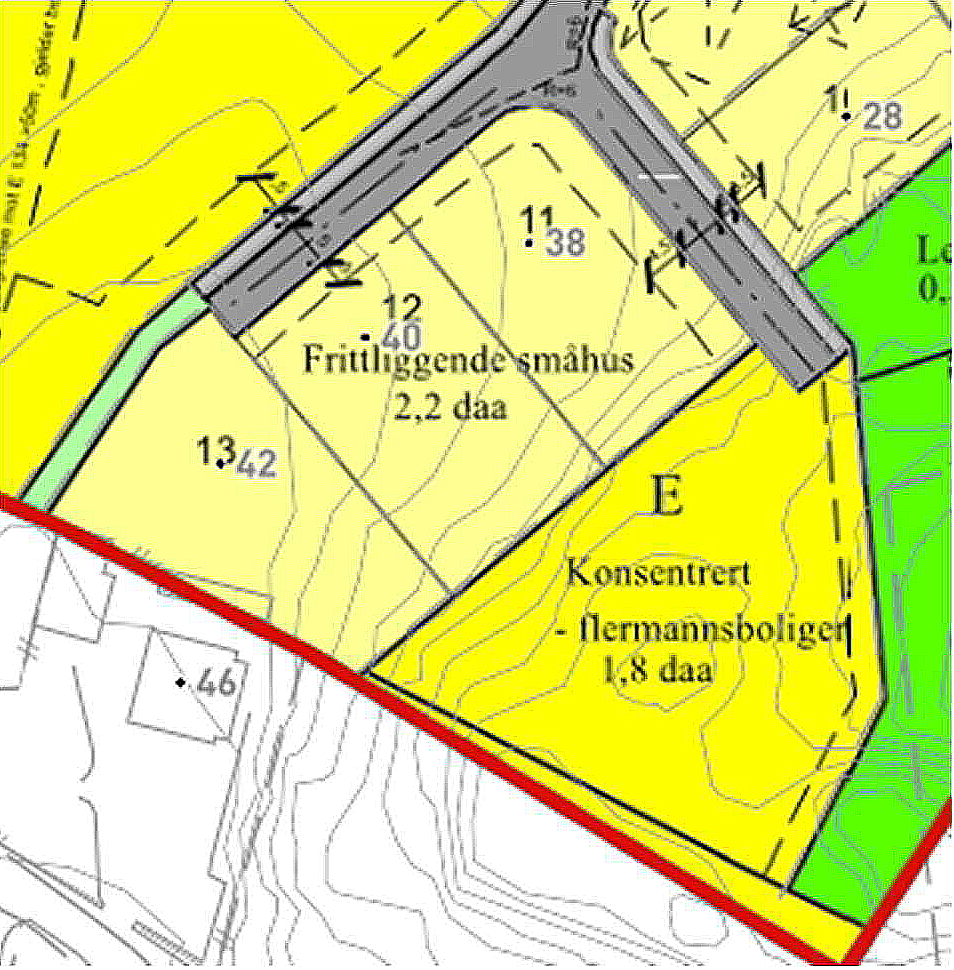 - Inkludere eneboligtomtene 11-13 i området til konsentrert bebyggelse (område E). Endringen gjelder både i plankart og tilpasning i planbestemmelsene.
